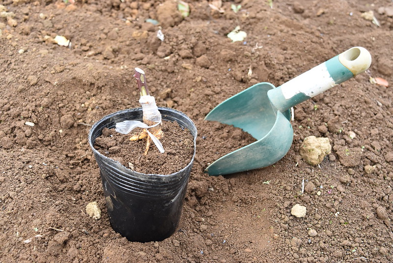 また、フロリバンダのプラムパーフェクトは地植えにする予定でしたが、鉢植えで置いてから2年以上経ち、鉢外に飛び出た根が地面に張ってしまっていました。作業時まだ秋でしたので根を触るリスクが高く、鉢から出すことはかないませんでした。
