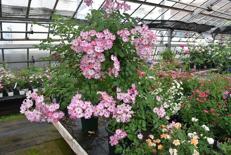 まずは温室のまわりのつるバラのご説明からスタートしました。しなやかなフランソワジュランビルや、定番のピエールドゥロンサール。